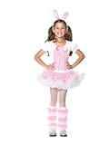 The Child Fluffy Bunny Costume is too cute for words with its pink and white ruffles and bunny ears. The costume features a white dress with pink polka dot petticoat skirt, pink ruffle front, bow tie, and white bunny tail. It also includes fluffy pink and white leg warmers and matching bunny ears headband. It's a great costume for an Alice in Wonderland theme for Halloween, too!